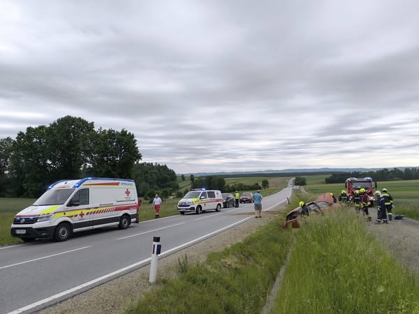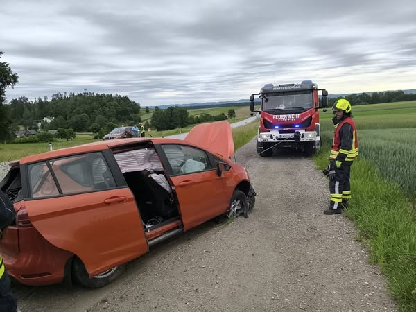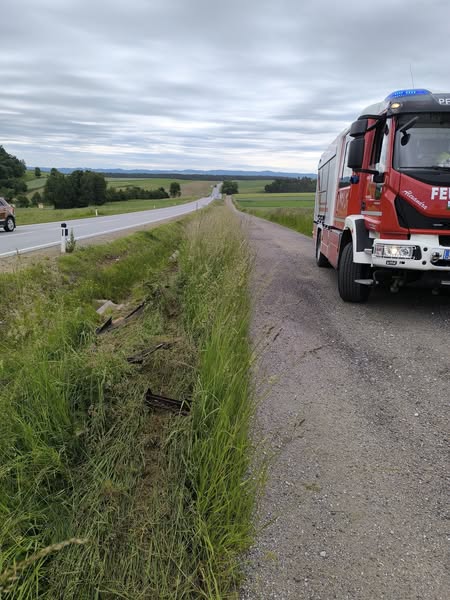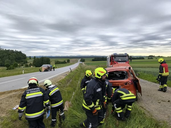 Am 07. Juni wurden wir um 11:12 Uhr bereits zum zweiten Mal mittels Handy zu einem Verkehrsunfall mit verletzter Person auf der B5 StrKM 17,4 gerufen. Aus unbekannter Ursache dürfte die Frau von Waidhofen kommend in Fahrtrichtung Pfaffenschlag links von der Fahrbahn abgekommen sein und kam einige Meter später im Graben zum Stillstand. Eine örtliche Umleitung durch das Ortsgebiet von Gr. Eberharts wurde eingerichtet, da die B5 kurzzeitig gesperrt werden musste. Nach Freigabe der Polizei wurde das stark beschädigte Unfallfahrzeug mittels Seilwinde geborgen und mittels Abschleppachse abtransportiert. Abschließend wurde die Straße noch gereinigt. Wir bedanken uns bei der FF Gr. Eberharts, sowie dem Roten Kreuz und der Polizei für die gewohnt gute Zusammenarbeit! Nach ca. 45min konnten wir wieder ins Feuerwehrhaus einrücken.
